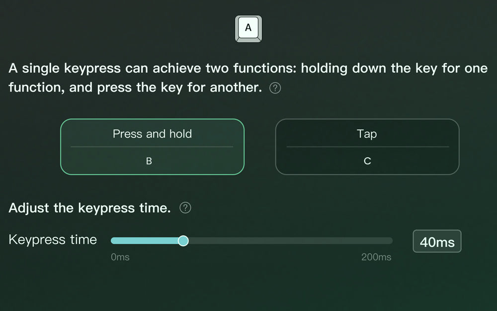 Adjustable Actuation Distance These magnetic switches allow users to adjust every key’s actuation point from 0.1mm to 3.4mm, which offers different kinds of pressing for gaming or typing. |