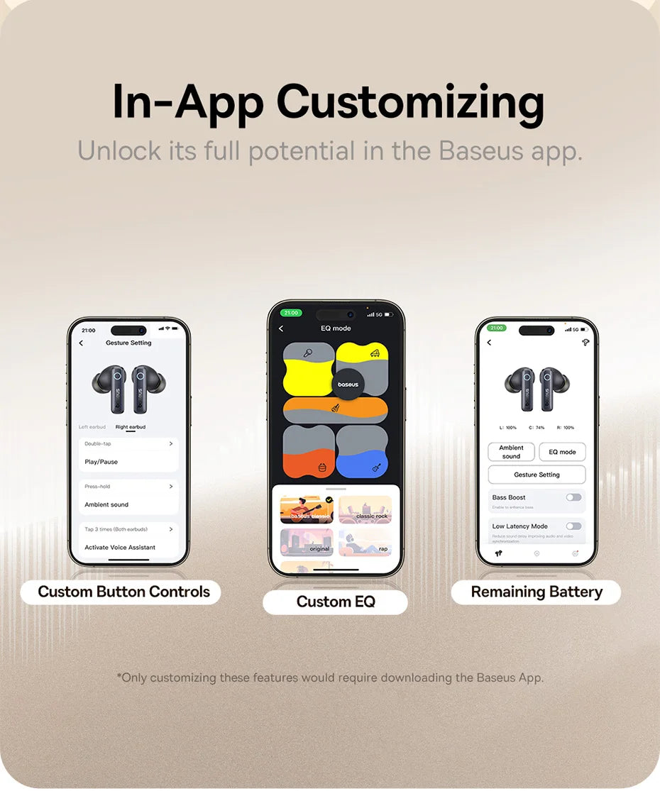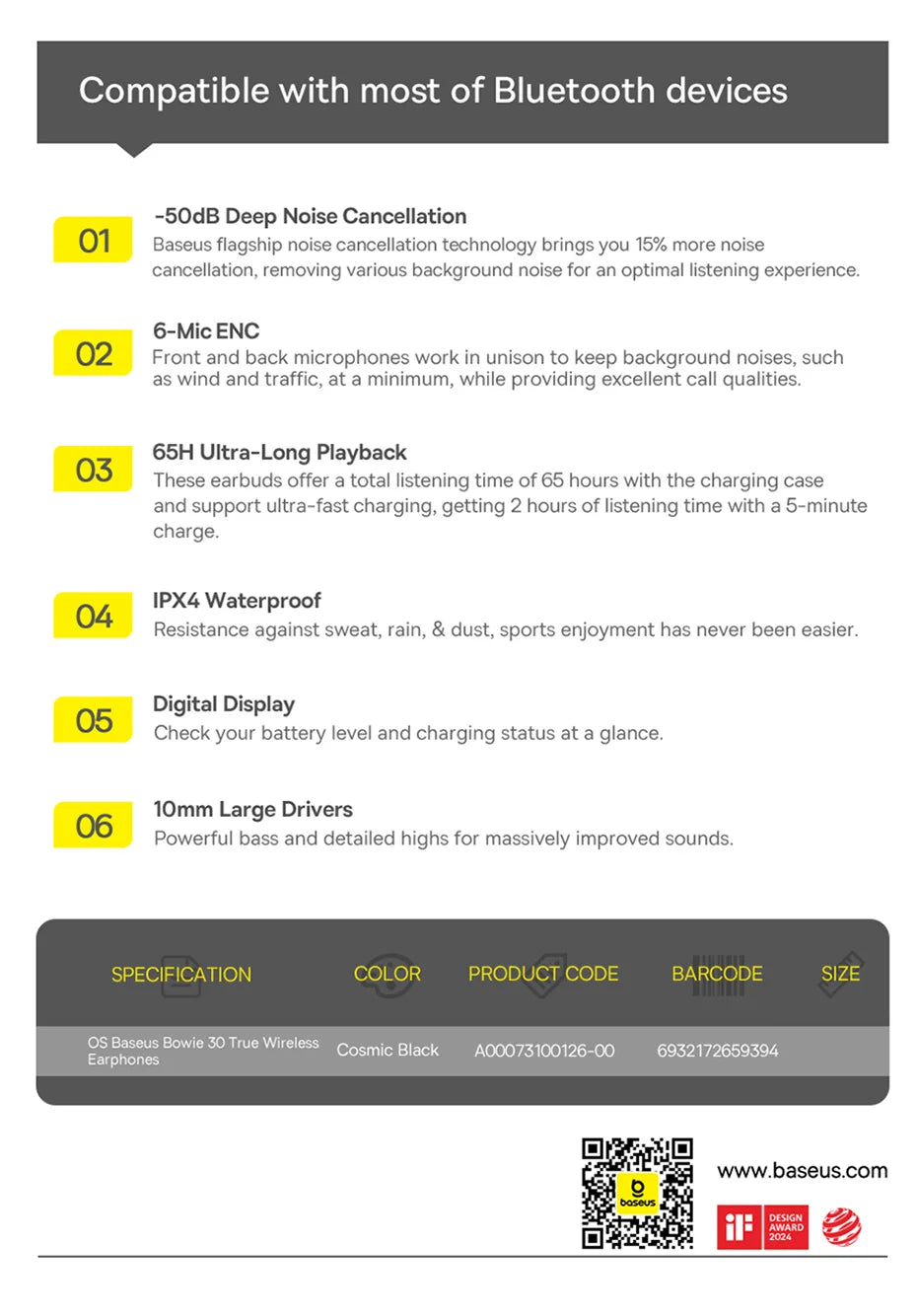 SEO Title: Baseus Bowie 30 Wireless Earbuds - 50dB ANC, 6 Mics, 65H Battery