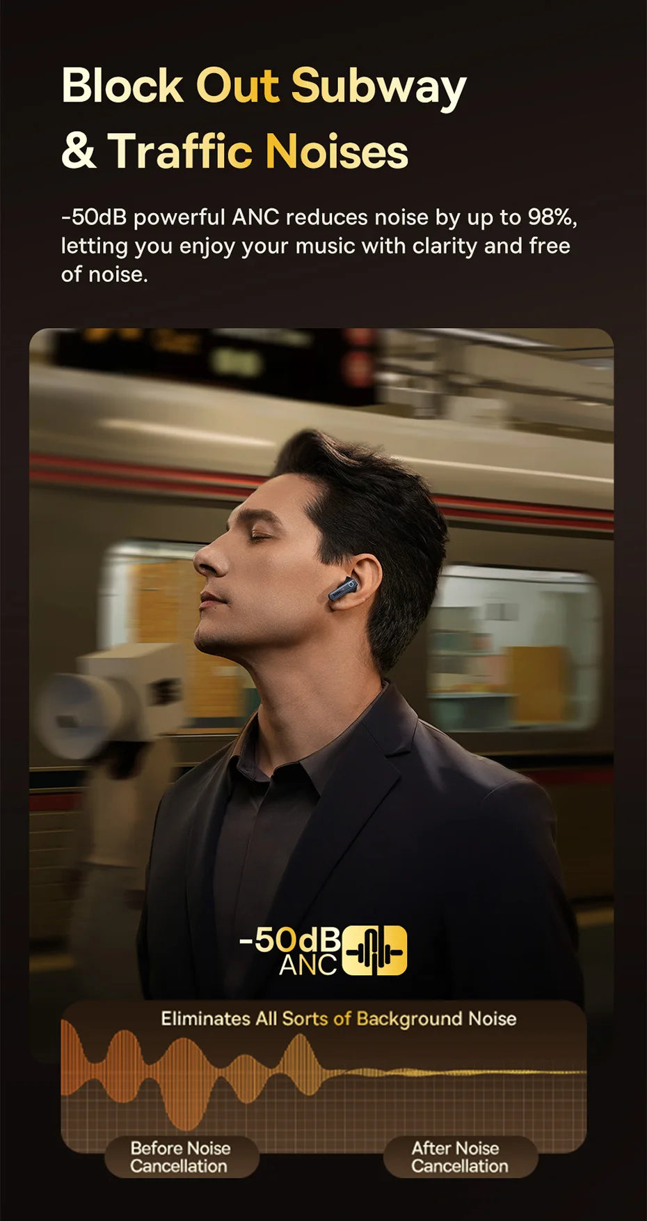 Industry-leading 50dB ANC blocks out ambient noise for immersive listening—perfect for commutes, travel, and focused work in any environment.6 Mics with AI Call Clarity