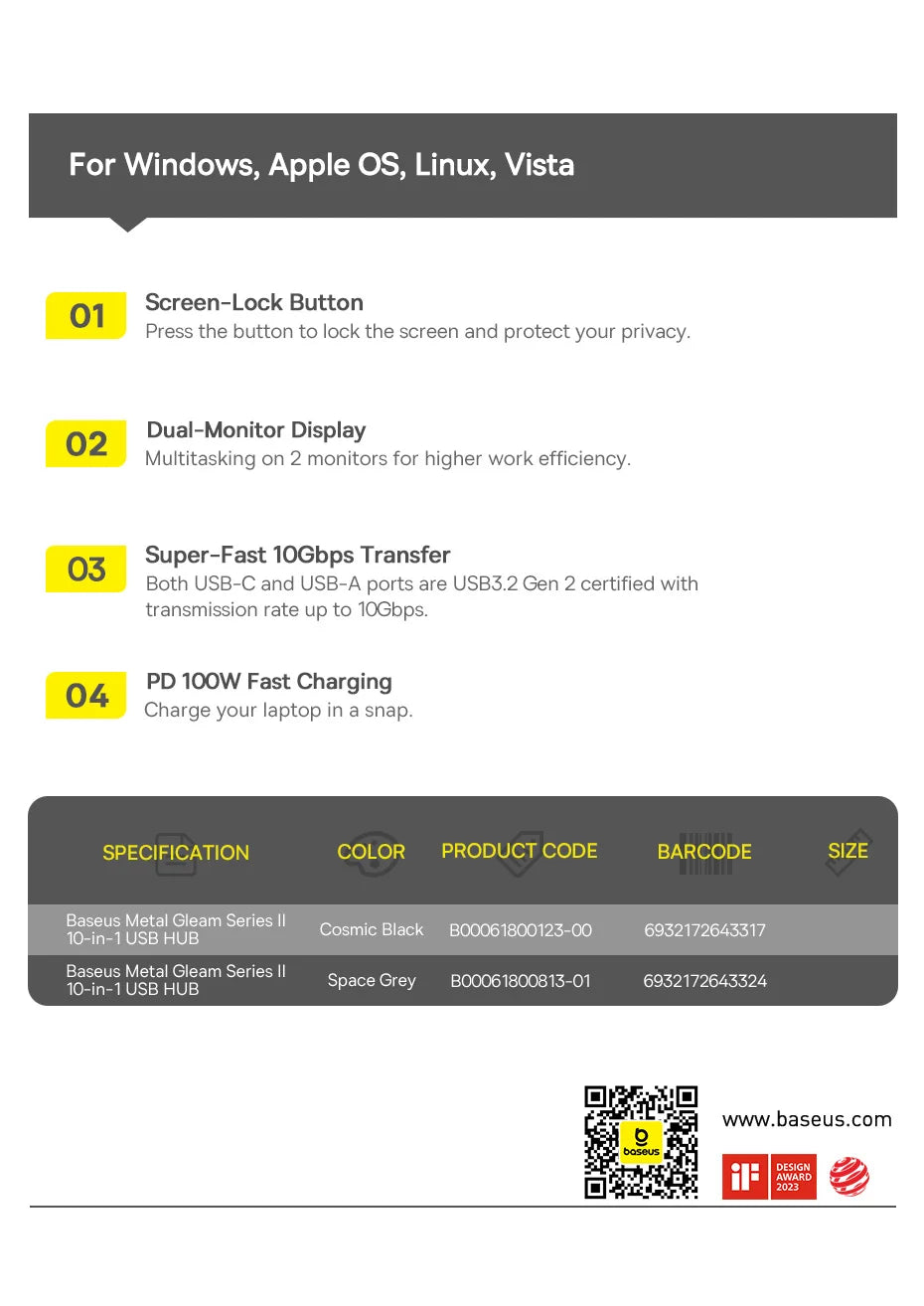 Name: Baseus Metal Gleam Series II 10-in-1 USB HUB (Dual Display)