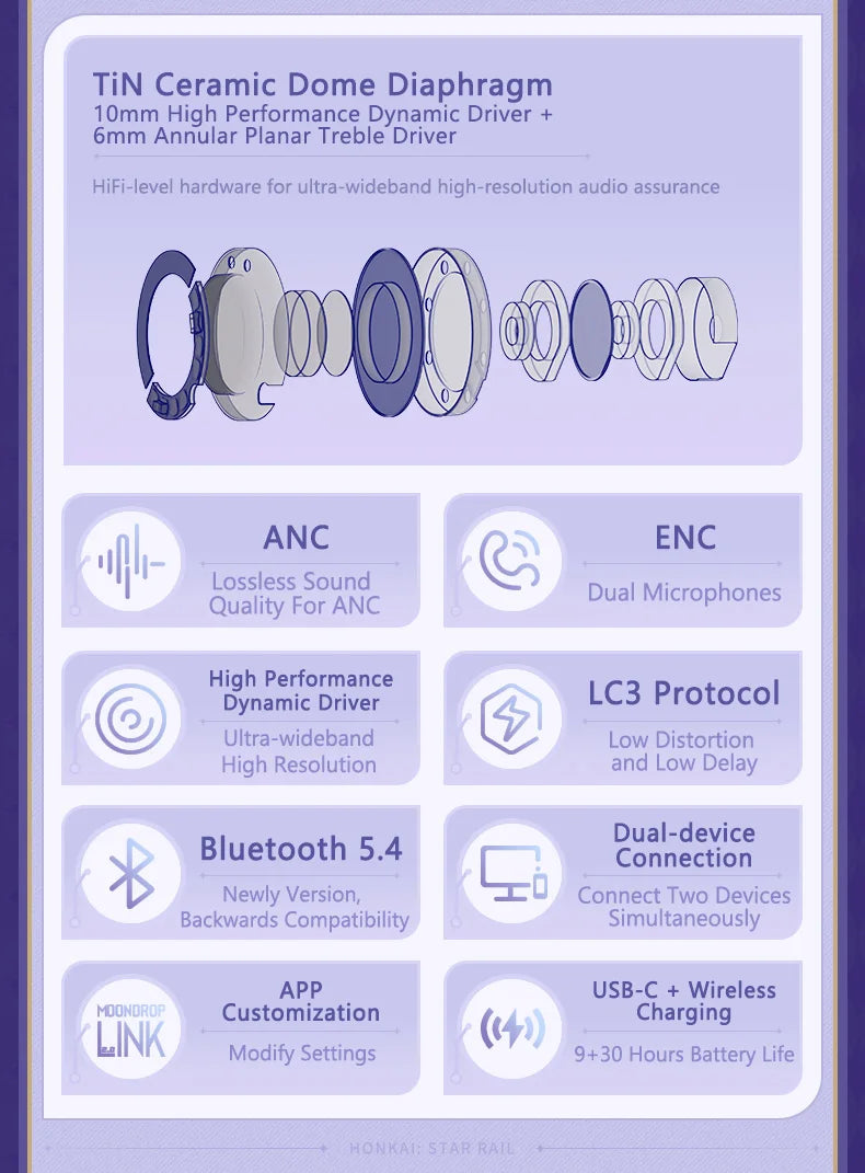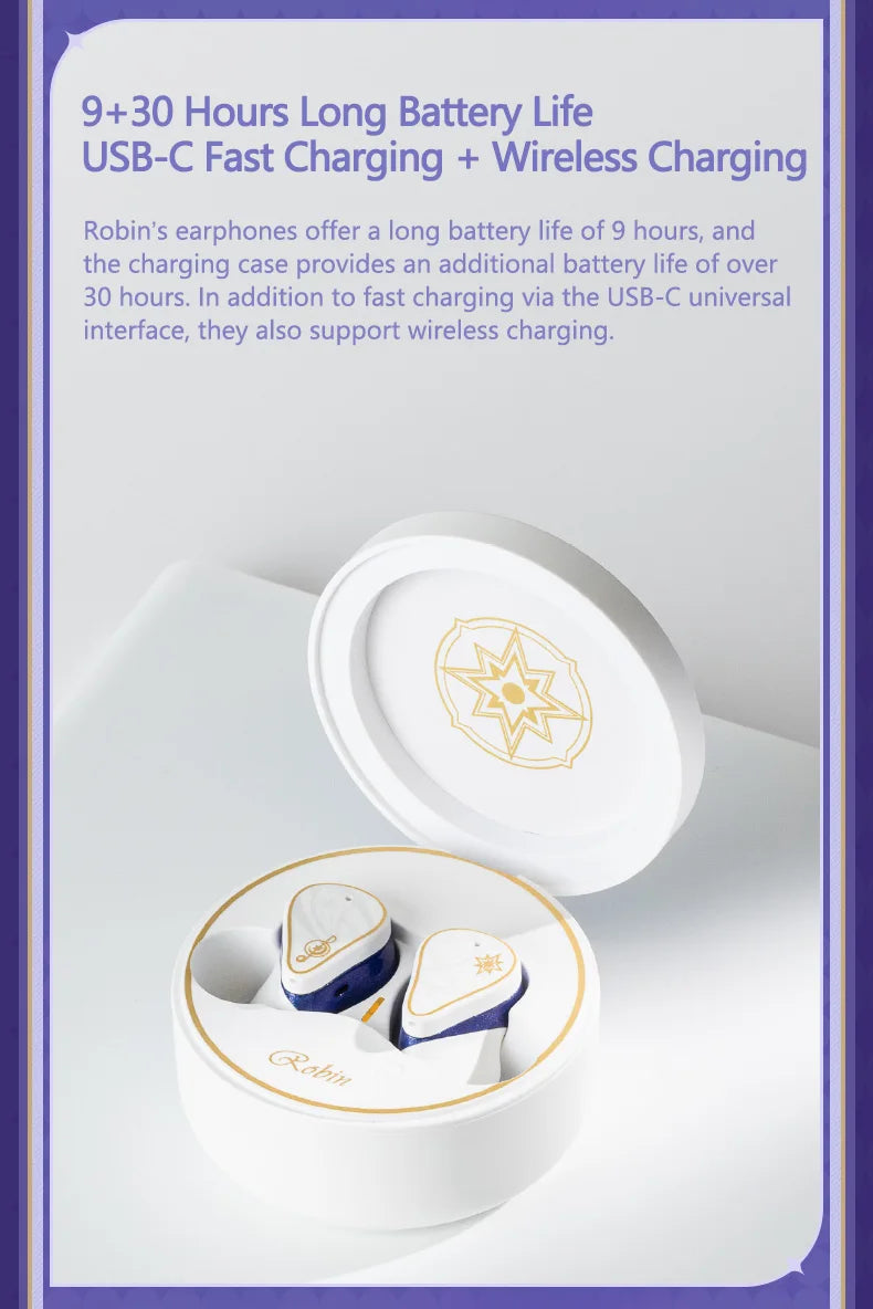 Premium true wireless earphones featuring hybrid driver technology with dynamic and planar drivers for exceptional audio quality. Inspired by Honkai Star Rail's Robin character design.