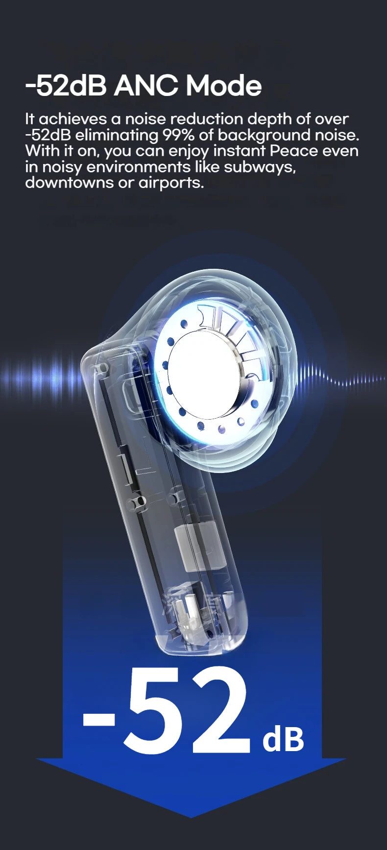 [ -52dB Hybrid Active Noise Cancelling ] Featuring a cutting-edge hybrid digital noise reduction technology and 6 optimized high signal-to-noise ratio microphones, it achieves a noise reduction depth of over -52dB, eliminating 99% of background noise. The reduction range covers a wide variety of noises. With it on, you can enjoy instant peace even in noisy environments like downtowns, subways, or airports.