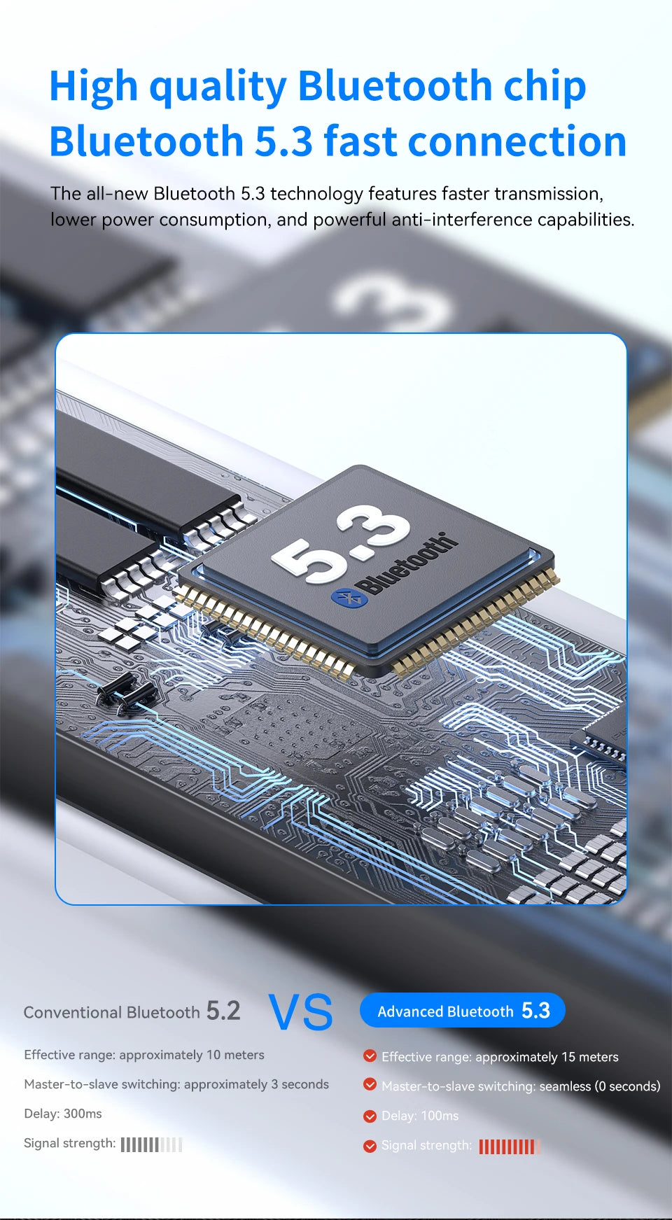 Bluetooth 5.3 Technology – Latest wireless standard delivers stable connection, lower latency, and extended range